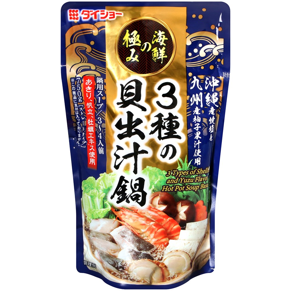 Daisho- Three Shellfish Broth Hot Pot Soup with Okinawan Salt and Kyushu Yuzu Juice 750g is a must for seafood hot pot lovers. Three-shellfish umami blend. Okinawan salt + Kyushu yuzu. 750g family size. Easy to use. It lets you enjoy restaurant-quality shellfish hot pot at home effortlessly.