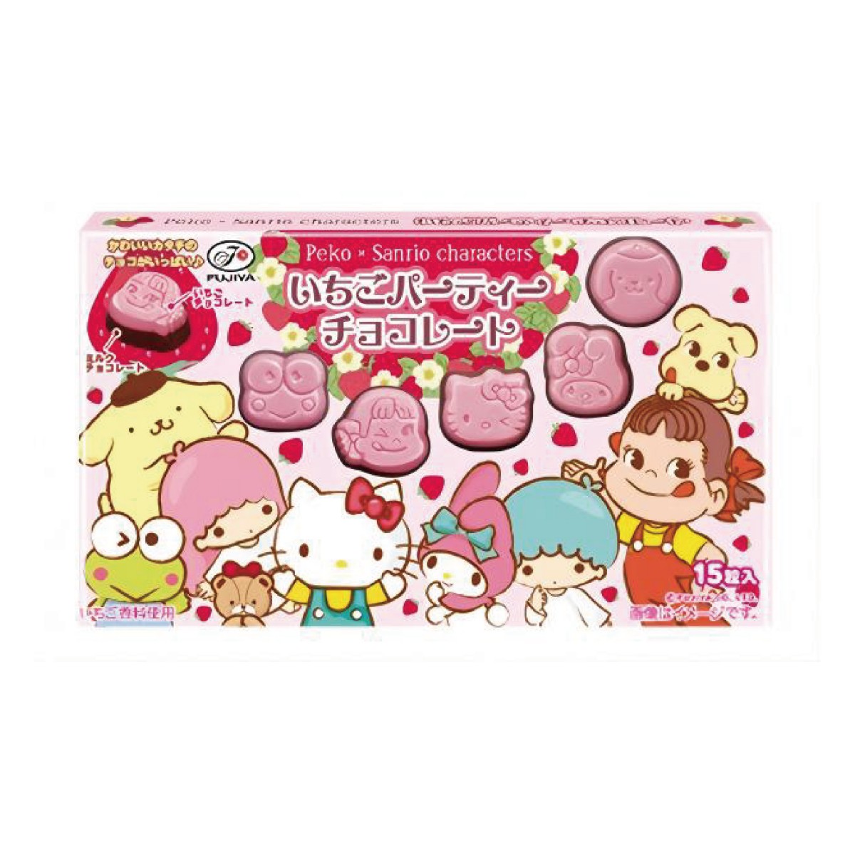 FUJIYA Peko x Sanrio Strawberry Party Chocolate creates sweet memories. Exciting character collaboration. Sweet strawberry milk chocolate flavor. Festive party theme design. Individually wrapped for freshness. With this special edition chocolate, you can host the sweetest party featuring your favorite characters in every delicious bite.